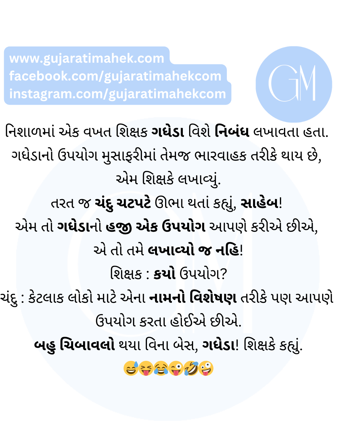 નિશાળમાં એક વખત શિક્ષક ગધેડા વિશે નિબંધ લખાવતા હતા.